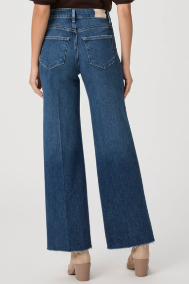 This modern high-rise wide leg has a slightly relaxed fit and a 31” inseam. Cut from TRANSCEND VINTAGE denim in an aged dark wash with natural fading, German gold hardware, and a raw hem, this style has the look of authentic vintage denim but is incredibly comfortable with plenty of stretch and recovery.