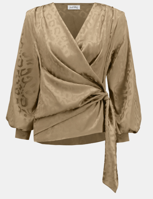 This jacquard satin top showcases a charming fitted silhouette and an elegant wrap neckline for a refined look. Long puff sleeves with tailored cuffs and delicate pleating at the front shoulder add a hint of dramatic flair to the garment.