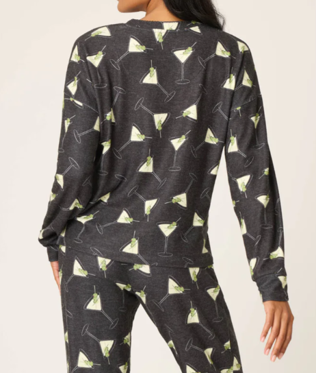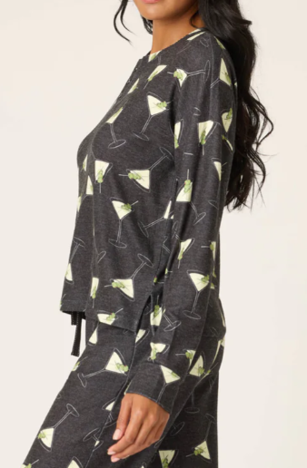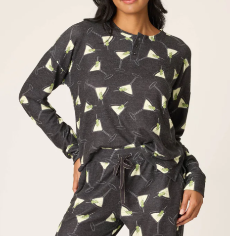 Toast the season in comfort. This pajama top is crafted from peachy-soft knit with a festive martini glass print, complete with green olives. Pair it with the matching drawstring jogger pants and make it a merry choice for nights in.