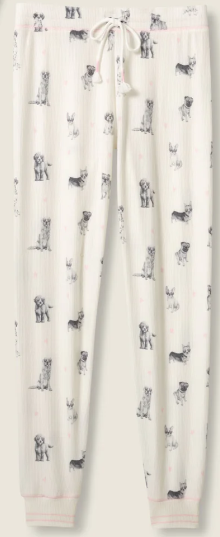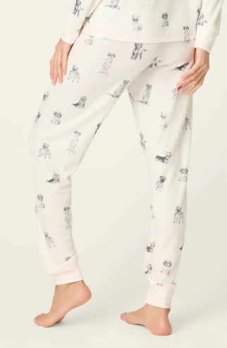 Dog moms, this one’s for you—a pajama pant crafted in our soft baby peachy waffle knit and covered in hand-sketched pups wearing heart-shaped sunglasses. The jogger pants are trimmed with pink stitching for a playful touch—made for cozy nights with your favorite four-legged Valentine.