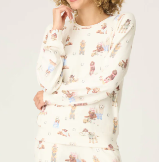 Round up some cozy charm. This ivory pajama top—crafted from soft peachy jersey— scalloped long sleeve top in an allover western dog print with cowboy hats, boots, guitars, horseshoes, and playful pups ready for the rodeo. A perfect match for lazy mornings or curling up after sundown.