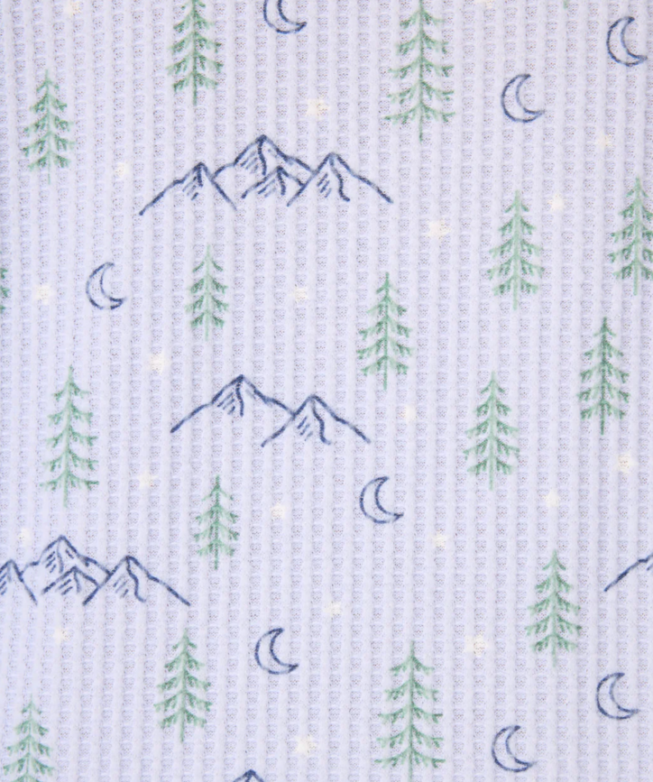 The ultimate après ski uniform—this tree-print pajama set is made for cozy nights in after a day on the slopes. Crafted from brushed thermal with the perfect touch of stretch, the long-sleeve henley top and jogger pants feature a snowy periwinkle backdrop sprinkled with evergreen trees, mountain peaks, and crescent moons. Striped cuffs and a contrast drawstring add a playful finish. Whether you’re curled up by the fire with a hot cocoa, sipping a favorite cocktail, or winding down under a blanket with a movie, this set is your go-to for alpine-inspired lounging.