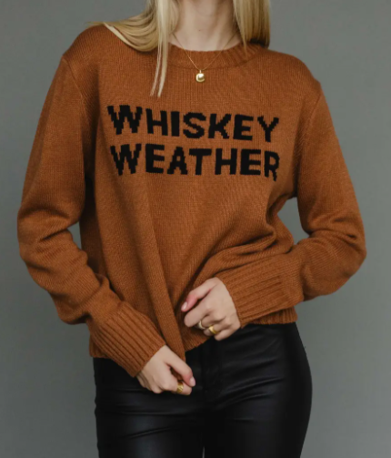 Brown knit sweater with black "Whiskey Weather" text on the front